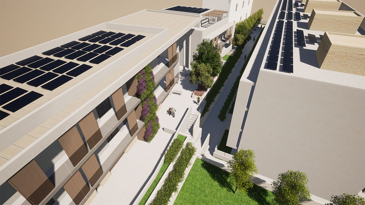 Il terrazzo del complesso ospiterà, nascondendoli alla vista, i pannelli fotovoltaici, cuore della produzione di energia elettrica che verrà utilizzata per illuminare le aree comuni condominiali e contribuire al sostentamento energetico di ogni appartamento.